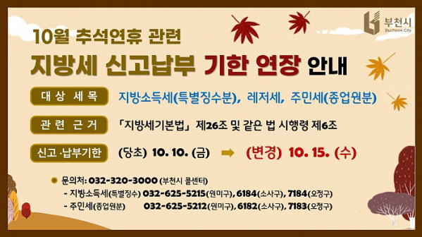 ºÎõ½Ã´Â ±ä Ãß¼® ¿¬ÈÞ·Î ÀÎÇØ ½Ã¹ÎµéÀÌ Áö¹æ¼¼¸¦ ±âÇÑ ³»¿¡ ½Å°í¡¤³³ºÎÇÏ´Â µ¥ ºÒÆíÀ» °ÞÀ» °ÍÀ¸·Î ¿¹»óµÊ¿¡ µû¶ó, 10¿ù ³³ºÎ ´ë»óÀÎ Áö¹æ¼¼ 3Á¾ÀÇ ½Å°í¡¤³³ºÎ ±âÇÑÀ» ±â..