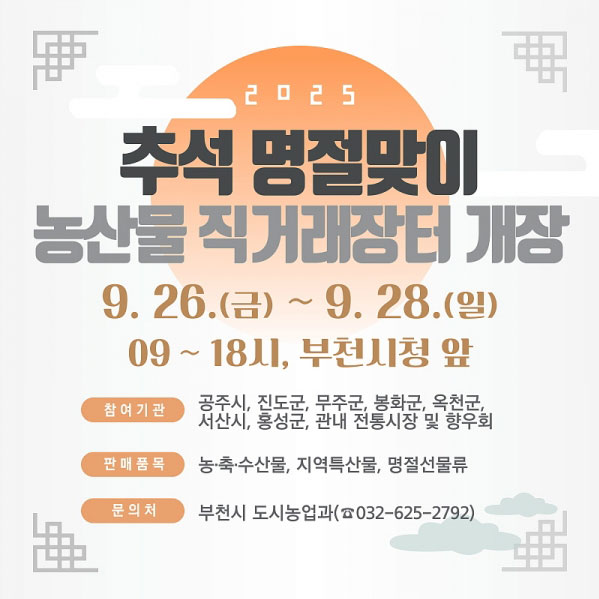 ºÎõ½Ã´Â Ãß¼®À» ¾ÕµÎ°í ¿À´Â 9¿ù 26ÀϺÎÅÍ 28ÀϱîÁö »çÈê°£ ½Ãû Á¤¹®¿¡¼ ¡®2025³â Ãß¼® ¸íÀý¸ÂÀÌ ³ó»ê¹° Á÷°Å·¡ÀåÅÍ¡¯¸¦ ¿î¿µÇÑ´Ù.