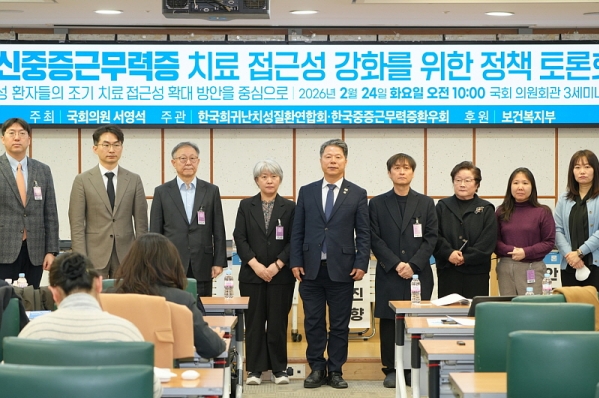 ¼¿µ¼® ´õºÒ¾î¹ÎÁÖ´ç ÀÇ¿ø(°æ±â ºÎõ½Ã°©, ±¹È¸ º¸°Çº¹ÁöÀ§¿øÈ¸)ÀÌ ÁÖÃÖÇϰí Çѱ¹Èñ±Í¡¤³Ä¡¼ºÁúȯ¿¬ÇÕȸ¿Í Çѱ¹ÁßÁõ±Ù¹«·ÂÁõȯ¿ìȸ°¡ ÁÖ°üÇÑ ¡ºÀü½ÅÁßÁõ±Ù¹«·ÂÁõ(MG) Ä¡·á Á¢±Ù¼º °È¸¦ À§ÇÑ Á¤Ã¥ Åä·Ðȸ¡»°¡ Áö³ 24ÀÏ(È) ¿ÀÀü 10½Ã ±¹È¸ÀÇ¿øÈ¸°ü Á¦3¼¼¹Ì³ª½Ç¿¡¼ ¿·È´Ù.