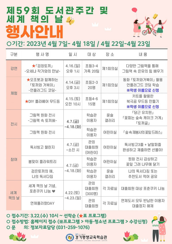 ¾Æ¿ï·¯ 4¿ù 23ÀÏ ¡®¼¼°è Ã¥ÀÇ ³¯ ¹× ÀúÀÛ±ÇÀÇ ³¯¡¯¿¡´Â ¡ã¼¼°è Ã¥ÀÇ ³¯ ±â³ä, Æ÷ÃáÄíŰ ¼±¹° ³ª´® ¡ã¿¬Ã¼µµ¼¹Ý³³ ½Ã ´ëÃâÁ¤Áö ÇØÁ¦ÇÏ´Â ¡®¿¬Ã¼Ç®·¯¿ÔDAY¡¯¸¦ ¿î¿µÇØ Áö¿ªÁÖ¹ÎÀÇ µµ¼°ü ÀÌ¿ëÀ» ³ô¿© ³ª°¥ °èȹÀÌ´Ù.