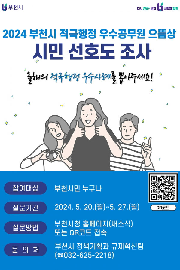 ºÎõ½Ã(½ÃÀå Á¶¿ëÀÍ)°¡ 2024³âµµ Àû±ØÇàÁ¤ ¿ì¼ö°ø¹«¿ø À¸¶ä»ó ¼±¹ßÀ» À§ÇÑ ½Ã¹Î ¿Â¶óÀÎ Á¤Ã¥¼±È£µµ Á¶»ç¸¦ 5¿ù 20ÀϺÎÅÍ 27ÀϱîÁö ½Ç½ÃÇÑ´Ù°í ¹àÇû´Ù.À̹ø Á¶»ç´Â °¢ ºÎ¼..