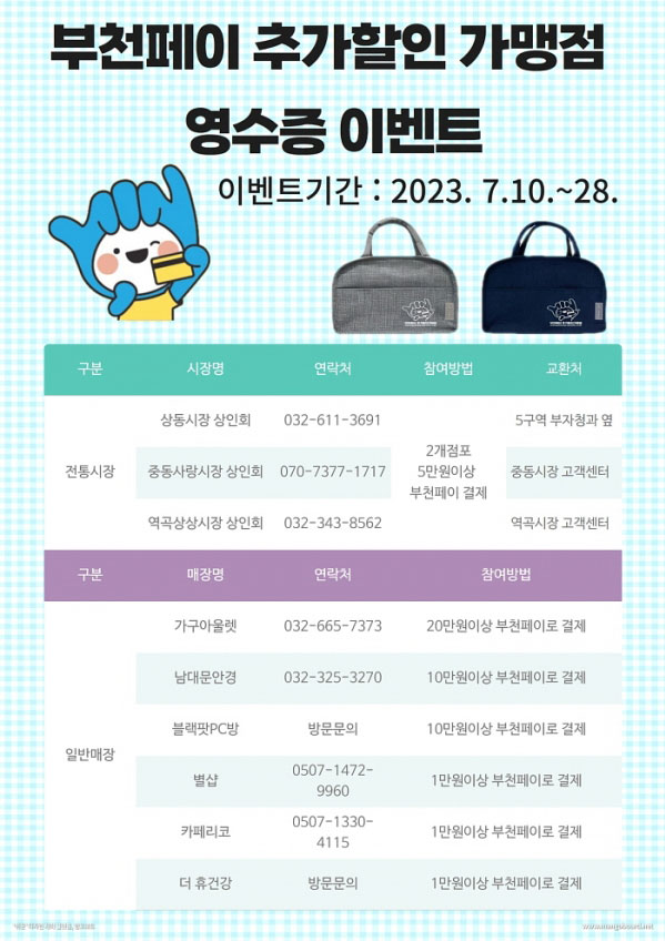ºÎõ½Ã(½ÃÀå Á¶¿ëÀÍ)´Â ¡®ºÎõÆäÀÌ Ãß°¡ÇÒÀÎ °¡¸ÍÁ¡¡¯¿¡¼ ¿À´Â 28ÀϱîÁö ºÎõÆäÀÌ(Áö¿ªÈÆó)·Î °áÁ¦ ÈÄ ¿µ¼öÁõ ÀÎÁõÀ» ÇÏ¸é º¸³Ã¹éÀ» ÁÖ´Â À̺¥Æ®¸¦ ÁøÇàÇÑ´Ù°í ¹àÇû´Ù.¡®..