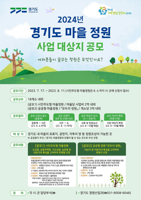 °æ±âµµ°¡ ¡®2024³â °æ±âµµ ¸¶À» Á¤¿ø Á¶¼º»ç¾÷¡¯ Âü¿© ´ë»óÁö¸¦ ¸ðÁýÇÑ´Ù.¡®°æ±âµµ ¸¶À» Á¤¿ø Á¶¼º»ç¾÷¡¯Àº ¸¶À» ³» ºó °ø°£À» Ȱ¿ëÇÑ Á¤¿øÁ¶¼º, ´Ù¾çÇÑ Á¤¿ø±³À° ÇÁ·Î±×·¥..