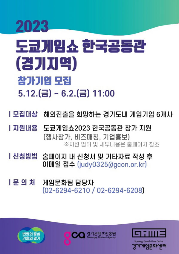 °æ±âµµ´Â ¡®2023³â µµÄì°ÔÀӼ Çѱ¹°øµ¿°ü Âü¿©±â¾÷À» ¿À´Â 6¿ù 2ÀϱîÁö ¸ðÁýÇÑ´Ù.°æ±âµµ °ÔÀÓ ÇØ¿Ü ÁøÃâ ÆÇ·ÎÁö¿ø »ç¾÷Àº °æ±âµµ ³» °ÔÀÓ»çÀÇ ÇØ¿Ü½ÃÀå ÁøÃâ°ú ÇØ¿Ü ³×..
