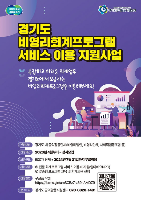°æ±âµµ°¡ µµ³» ºñ¿µ¸®´Üü ´ë»óÀ¸·Î ȸ°èÇÁ·Î±×·¥À» ¹«·á·Î º¸±ÞÇÑ´Ù.½Åû ´ë»óÀº °æ±âµµ¿¡¼ Ȱµ¿ÇÏ´Â ºñ¿µ¸®¹ýÀÎ, ºñ¿µ¸®¹Î°£´Üü, »çȸÀûÇùµ¿Á¶ÇÕ ¹× °íÀ¯¹øÈ£ÁõÀÌ ÀÖ´Â..