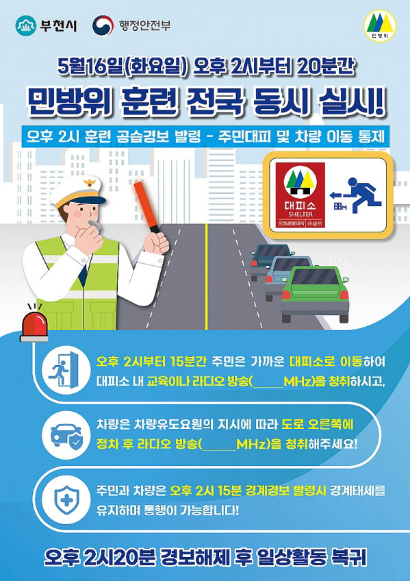 ºÎõ½Ã(½ÃÀå Á¶¿ëÀÍ)´Â ¿À´Â 16ÀÏ ÇàÁ¤¾ÈÀüºÎ ÁÖ°üÀ¸·Î ¡®Á¦414Â÷ ¹Î¹æÀ§ÀÇ ³¯¡¯ ºñ»ó °ø½À»óȲ ´ëÇÇ ÈÆ·ÃÀ» Àü±¹ÀûÀ¸·Î ½Ç½ÃÇÑ´Ù°í ¹àÇû´Ù.À̹ø ÈÆ·ÃÀº ¿ÀÈÄ 2½ÃºÎÅÍ °ø½À..