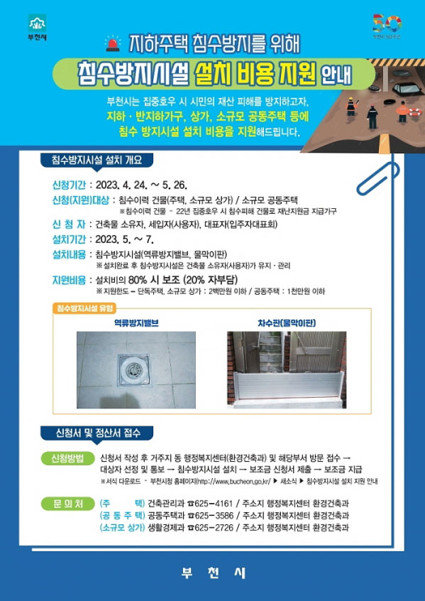 ºÎõ½Ã(½ÃÀå Á¶¿ëÀÍ)°¡ 2023³â ¿©¸§Ã¶ ħ¼ö ÇÇÇØ ¿¹¹æÀ» À§ÇØ ¹ÝÁöÇÏ ÁÖÅÃ, »ó°¡, ¼Ò±Ô¸ð °øµ¿ÁÖÅÃÀ» ´ë»óÀ¸·Î ħ¼ö¹æÁö½Ã¼³ ¼³Ä¡¸¦ Áö¿øÇÑ´Ù.Áö³ÇØ ¿©¸§Ã¶ ºÎõ¿¡ ÁýÁßÈ£..