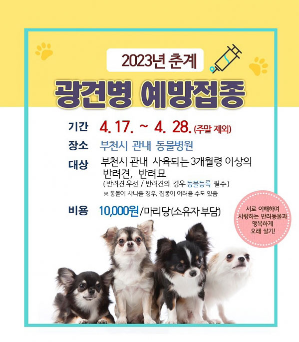 ºÎõ½Ã(½ÃÀå Á¶¿ëÀÍ)´Â ¿À´Â 17ÀϺÎÅÍ 28ÀϱîÁö °ü³» µ¿¹°º´¿ø 67°÷¿¡¼ 10Àϰ£(Å䡤ÀÏ Á¦¿Ü) Ãá°è ±¤°ßº´ ¿¹¹æÁ¢Á¾À» ½Ç½ÃÇÑ´Ù.µ¿¹°À» ÅëÇØ ±¤°ßº´¿¡ »ç¶÷µµ °¨¿°µÉ ¼ö ÀÖ..