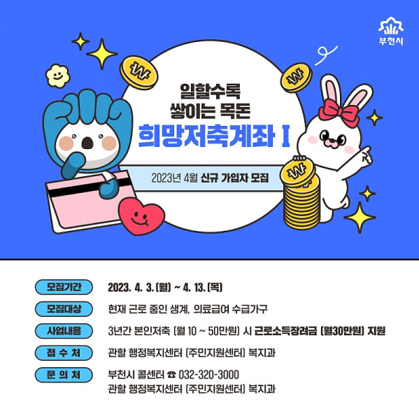 ºÎõ½Ã(½ÃÀå Á¶¿ëÀÍ)°¡ ¡®2023³â Èñ¸ÁÀúÃà°èÁÂ(¥°)¡¯ ½Å±Ô °¡ÀÔÀÚ ¸ðÁýÀ» ÅëÇØ Ãë¾à°èÃþÀÇ ÀÚ»êÇü¼ºÀ» Áö¿øÇÑ´Ù.¿À´Â 4¿ù 3ÀϺÎÅÍ 13ÀϱîÁö ÀÏÇÏ´Â »ý°è․ÀÇ·á±Þ¿© ¼ö..