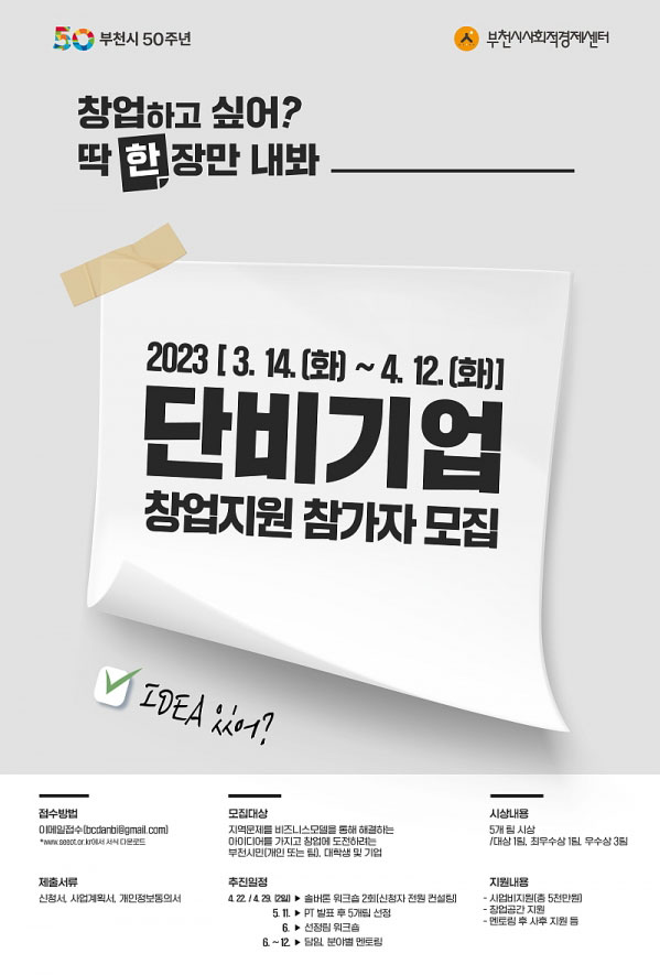 ºÎõ½Ã(½ÃÀå Á¶¿ëÀÍ)´Â ¿À´Â 14ÀϺÎÅÍ 2023³â ´Üºñ±â¾÷ â¾÷Áö¿ø »ç¾÷ Áö¿øÀÚ¸¦ ¸ðÁýÇÑ´Ù.¿ÃÇØ·Î 7³â° ¿î¿µÇÏ´Â ´Üºñ±â¾÷Àº ºÎõÇü ¼Ò¼Èº¥Ã³ ±â¾÷ ƯȺ귣µå·Î Áö¿ªÀÇ °¡..