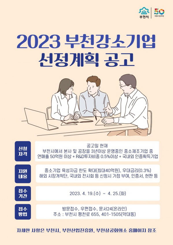 ºÎõ½Ã(½ÃÀå Á¶¿ëÀÍ)´Â µ¶Ã¢ÀûÀÎ ±â¼ú·Â°ú ¹«ÇÑÇÑ ¼ºÀåÀáÀç·ÂÀ» °¡Áø ÀÛÁö¸¸ °ÇÑ ¿ì¼ö Áß¼Ò±â¾÷À» ¹ß±¼ÇØ »ç±â¸¦ ÁøÀÛÇÏ°í ´ëÇ¥±â¾÷À¸·Î À°¼ºÇϱâ À§ÇØ 2023³â ºÎõ°¼Ò±â..