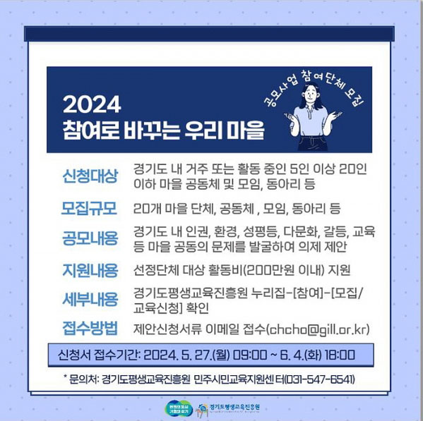 °æ±âµµ°¡ ¡®2024³â Âü¿©·Î ¹Ù²Ù´Â ¿ì¸®¸¶À» »ç¾÷¡¯ÀÇ Âü¿©´Üü¸¦ 6¿ù 4ÀϱîÁö ¸ðÁýÇÑ´Ù. Âü¿©·Î ¹Ù²Ù´Â ¿ì¸®¸¶À»Àº ¸¶À»ÀÇ ¹®Á¦¸¦ ÁÖ¹ÎÀÌ Âü¿©ÇØ ÇØ°áÇÏ´Â °úÁ¤¿¡¼ ¸¶À» ..