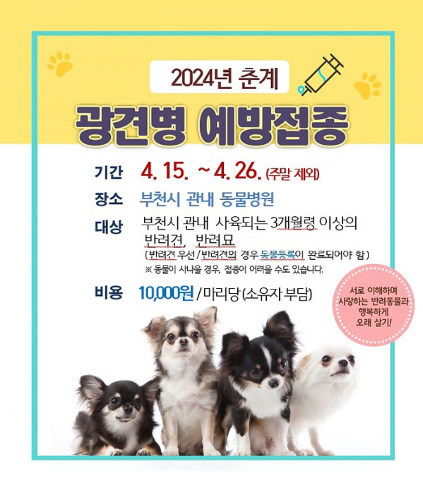 ºÎõ½Ã´Â ¿À´Â 4¿ù 15ÀϺÎÅÍ 26ÀϱîÁö °ü³» µ¿¹°º´¿ø 70°÷¿¡¼ 10Àϰ£(Å䡤ÀÏ Á¦¿Ü) Ãá°è ±¤°ßº´ ¿¹¹æÁ¢Á¾À» ½Ç½ÃÇÑ´Ù°í ¹àÇû´Ù.µ¿¹°À» ÅëÇØ »ç¶÷µµ ±¤°ßº´¿¡ °É¸± ¼ö ÀÖ´Â..