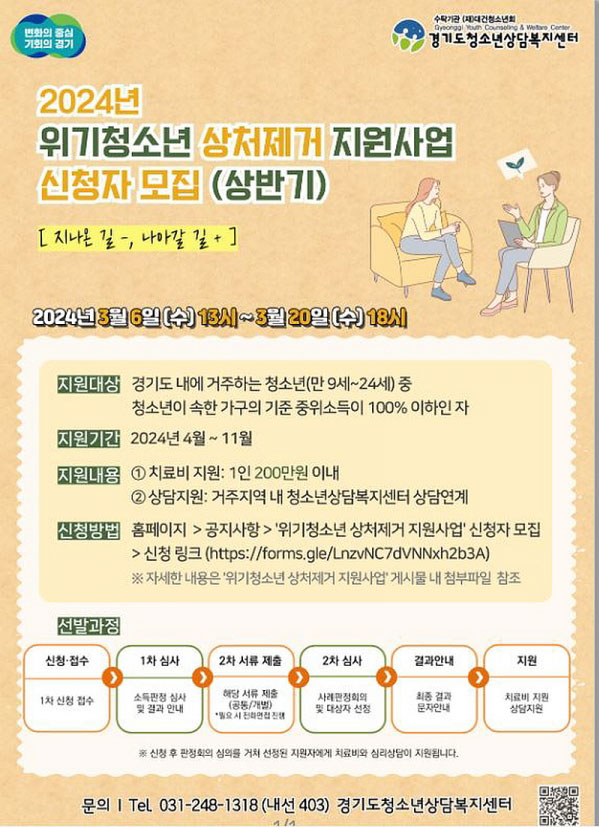 °æ±âµµ°¡ ¿Ü»óÀ¸·Î »ý±ä ÈäÅͳª ¹®½Å ¶§¹®¿¡ ½É¸®ÀûÀÎ ¾î·Á¿òÀ» °Þ´Â û¼Ò³âµé¿¡°Ô »óó Á¦°Å Ä¡·áºñ¿Í ½É¸®¡¤»ó´ãÀ» Áö¿øÇÏ´Â ¡®À§±âû¼Ò³â »óó Á¦°Å Áö¿ø»ç¾÷¡¯À» ¿î¿µ..