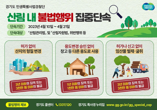 °æ±âµµ ¹Î»ýƯº°»ç¹ý°æÂû´ÜÀº 4¿ù 10ÀϺÎÅÍ 21ÀϱîÁö »ê¸² ³» ºÒ¹ý ÈÑ¼Õ ÇàÀ§¸¦ ÁýÁß ´Ü¼ÓÇÑ´Ù.µµ´Â »çÀü¿¡ Ç×°ø»çÁø ºñ±³ µîÀ» ÅëÇØ ºÒ¹ý ÈÑ¼Õ ÇàÀ§°¡ ÀǽɵǴ °÷µéÀ» Ư..