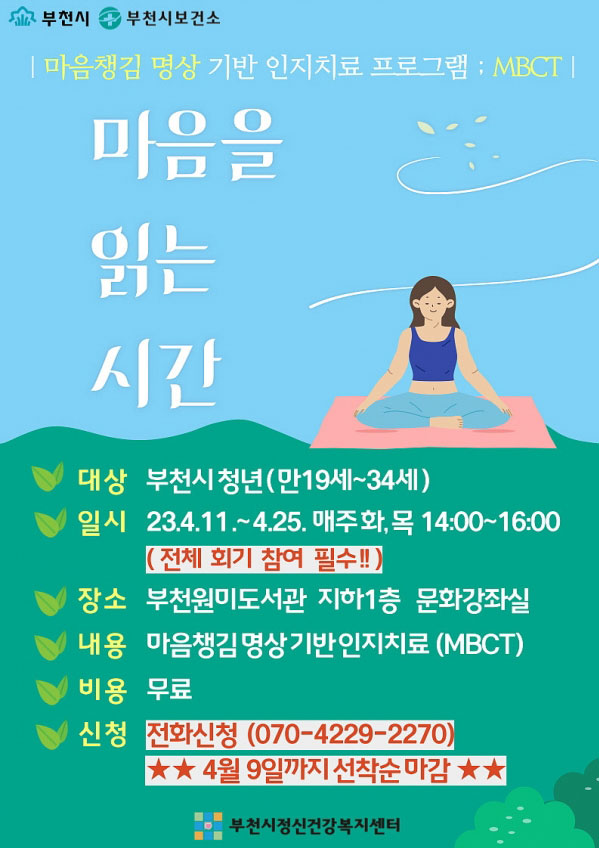 ºÎõ½Ã(½ÃÀå Á¶¿ëÀÍ)¿Í ºÎõ½ÃÁ¤½Å°Ç°º¹Áö¼¾ÅÍ(¼¾ÅÍÀå ±è½Å°â)´Â ºÎõ½Ã û³âÀ» ´ë»óÀ¸·Î ¡®¸¶À½Ã¬±è ¸í»ó ±â¹Ý ÀÎÁöÄ¡·á(MBCT) ÇÁ·Î±×·¥¡¯À» ¿î¿µÇÑ´Ù.ºÎõ½Ã¿Í ºÎõ½ÃÁ¤..