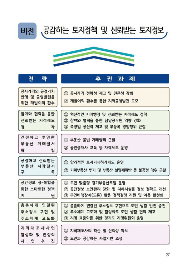 °æ±âµµ°¡ ¿ÃÇØ °ø°¨ÇÏ´Â ÅäÁöÁ¤Ã¥, ½Å·Ú¹Þ´Â ÅäÁöÁ¤º¸¸¦ ½ÇÇöÇϱâ À§ÇØ ¡®±øÅëÀü¼¼ ÇÇÇØ¿¹¹æ¡¯ µî ÅäÁöÁ¤º¸ ºÐ¾ß 75°³ °úÁ¦¸¦ ÁßÁ¡ ÃßÁøÇÑ´Ù.°æ±âµµ´Â ÀÌ·± ³»¿ëÀ» ´ãÀº 20..